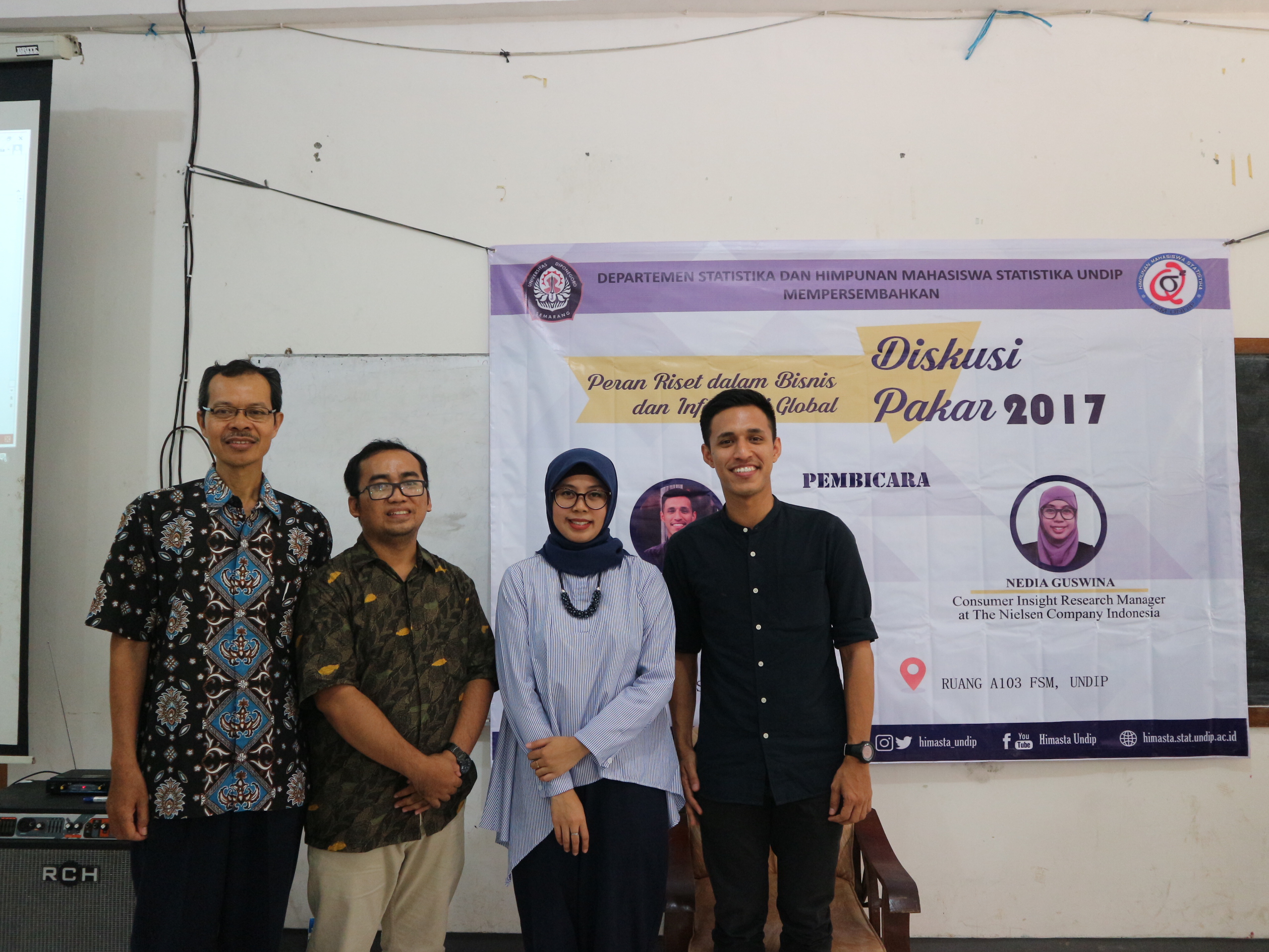 The 2017 expert discussion activity with the theme “The Role of Statistics Graduates in the Development of Research Institutions” was held on Saturday May 6, 2017 in Room A101 of FSM Undip Tembalang. The activity was attended by 87 students and 19 Undip statistics lecturers. The expert discussion program invited two speakers namely Habib A Tagafi, S.Si from Compentation and Benefit in British American Tobacco and Nedia Guswina S.Si from Research Manager at PT. Nielsen Company.